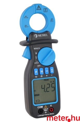 Szivárgóáram-mérő TRMS AC lakatfogó multiméter automatikus méréshatár választással. Fő funkciók: AC árammérés (100 A), feszültségmérés (600 V AC/DC), szivárgóáram mérése 0,01 mA felbontással, frekvenciamérés, teljesítménymérés, terjesítménytényező, harmonikusok vizsgálata, MIN, MAX, HOLD, PEAK funkciók, háttérfény.
